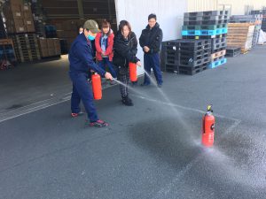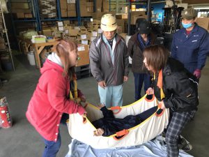 今年も、花尾防災さんにお願いをして防災訓練を実施しました。ベトナム人実習生も交えて、消火器の注意事項や使用方法の訓練。簡易タンカを使用して、倒れた人を運び出す訓練。実際に119番へ電話を掛ける通報訓練を実施しました。