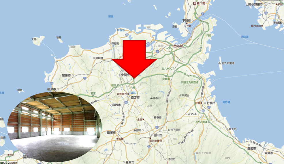 近々、図の場所にある、弊社倉庫に100坪の空きが出る予定です。高速のインターチェンジにも近く、筑豊や東九州方面への立地も良い場所です。お気軽にお問い合わせください!