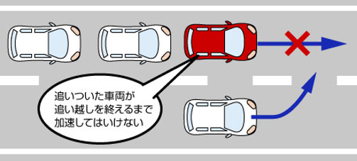 車両は、第二十二条第一項の規定に基づく政令で定める最高速度が高い車両に追いつかれたときは、その追いついた車両が当該車両の追越しを終わるまで速度を増してはならない。最高速度が同じであるか又は低い車両に追いつかれ、かつ、その追いついた車両の速度よりもおそい速度で引き続き進行しようとするときも、同様とする。