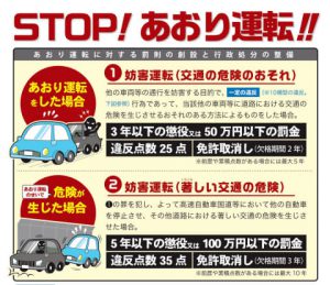 改正道路交通法では、通行妨害目的で交通の危険のおそれのある方法により一定の違反をした場合、罰則として3年以下の懲役または50万円以下の罰金行政処分として違反点数25点で免許取消し(欠格期間2年)となる。