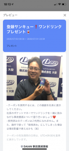 クーポンなんかも配れるので、下図のように、登録してくれた人にワンドリンククーポンなんかも配っています。