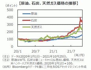 実はいま、世界的に原油だけでなく、石炭や天然ガスの価格も高騰しています。そもそも、通常、原油価格は天然ガスよりも高い事が普通です。それぞれメリットデメリットありますが環境面で言えば、CO2の排出量が少ない天然ガスは、環境政策を進む欧州を中心に需要が高まり、コロナからの経済回復等により需給がひっ迫し価格が跳ね上がっています。これによって、天然ガスよりも価値があると見られてきた原油が、一転格安なエネルギーに一時的になりました。すると、途上国を中心に需要が増加し、原油価格を押し上げる格好となってしまいました。