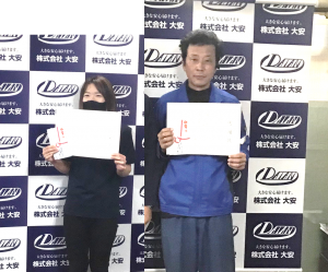 堺さんは、ダンプにメインで乗務しながらも、他の運行が困っていた場合、快く異動して他のトラックの運行に従事してくれたりと、周囲のことを考えて、いつも前向きな言動をしてくれる素晴らしい社員です。また、池平係長は、パートから弊社に入社していただき、今では倉庫の管理を任されるほど一生懸命ママさんになってさらに頑張ってくれています。