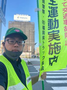 最後に、社長は福岡県トラック協会八幡分会の活動に参加し、早朝の通勤時間帯に交通量の多い交差点に立ち、啓蒙活動を行いました。