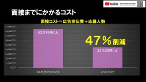 下の図は、実際の数字で、SNS特にYOUTUBEを始める前に比べると、面接までにかかる一人当たりのコストが約47%削減されていました。 多くの動画を投稿することで、通常の募集媒体の露出以上に認知度がアップしているからだと思います。