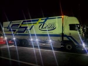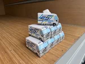 55周年の記念品として作成したアニバーサリーデザインのミニトラックを飾ってくれているトラックを発見しました! こうやって活躍しているのを見ると、嬉しいですね!