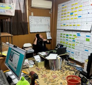 1か月程度の仮事務所なので、伊藤部長が遊び心満載の古い事務所を再現してくれました。