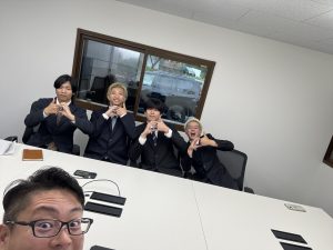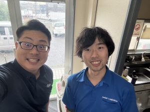 福岡支店にて、社長が業務をしていたら、高校新卒入社の入江君が帰庫したので、二人で自撮りしました。