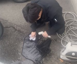 先日、福岡支店の高木くんが、フロアマットを磨いているのを発見!