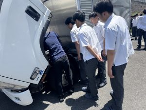 生徒たちは、提供したトラックの安全装置や構造を間近で見たり、実際に運転席に乗車する体験をしました。普段見慣れないトラックに、生徒たちは興味津々の様子で、隅々まで熱心に見学してくれました。