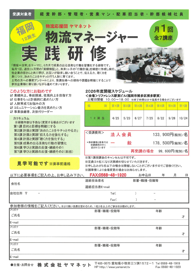 物流応援団ヤマネットが主催する人気研修、「物流マネージャー実践研修 福岡12期生」の案内が公開されました。