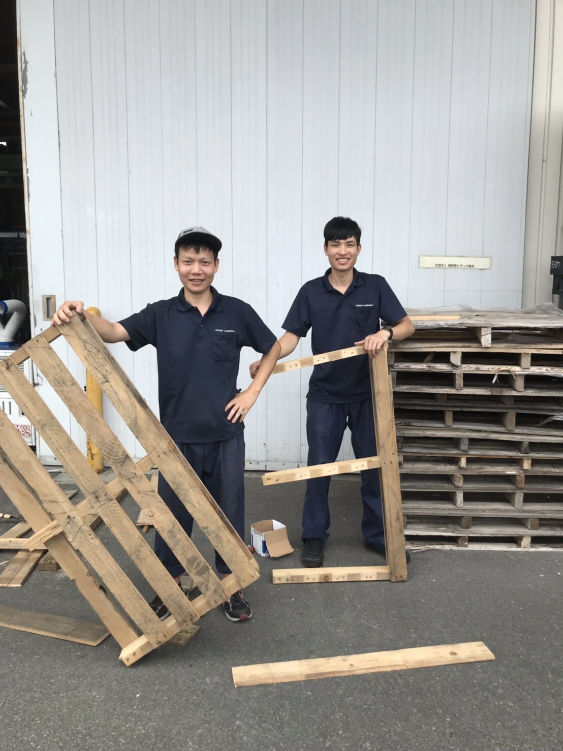 外国人技能実習生のタイン君とトゥイ君は、毎日いろんな作業を頑張ってくれています。 今回、木のパレットが大量に発生したので、捨てるのは勿体ないからと、DIYで棚...