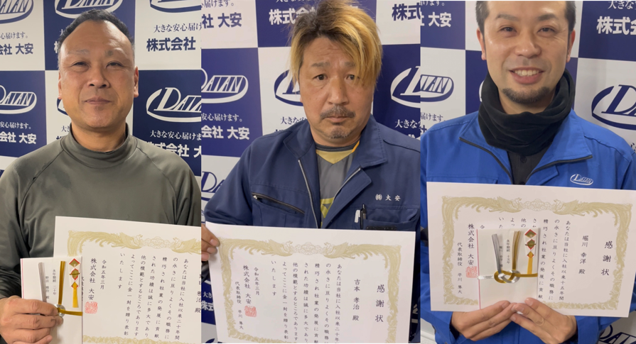 今年度の永年勤続表彰は、 20年が野田さん、吉本さん 15年が堀川さん 10年が竹中さん、立花さん 7年が高内さん、矢永さんでした。 矢永さんは、福岡支店所属で初めての... -